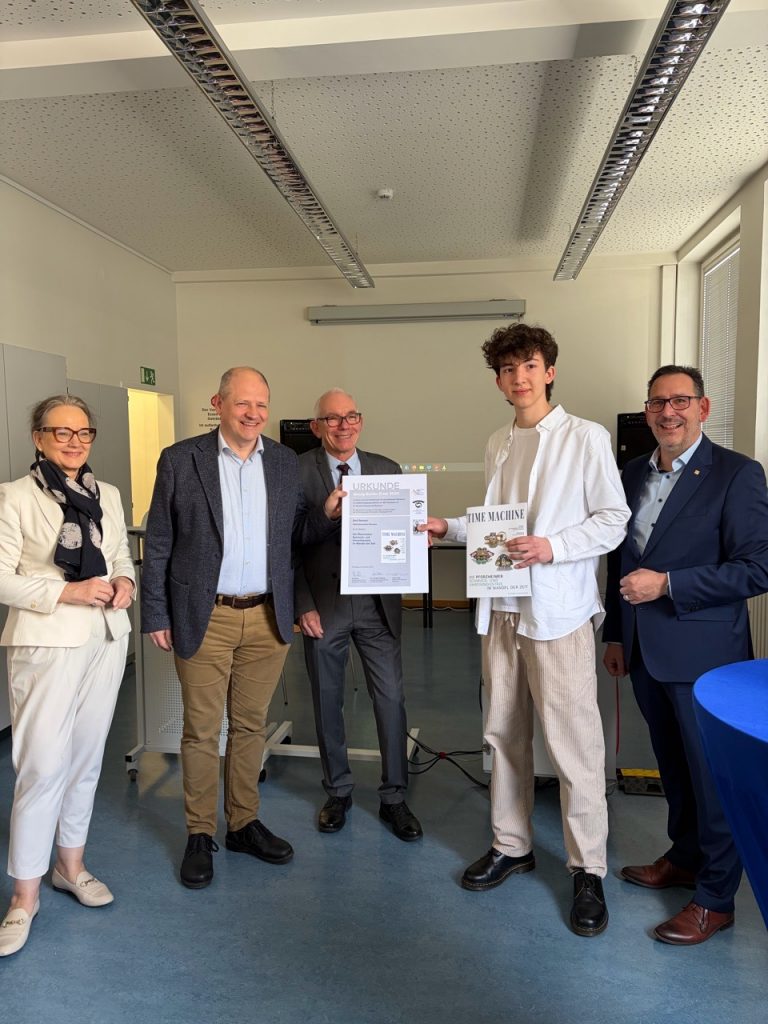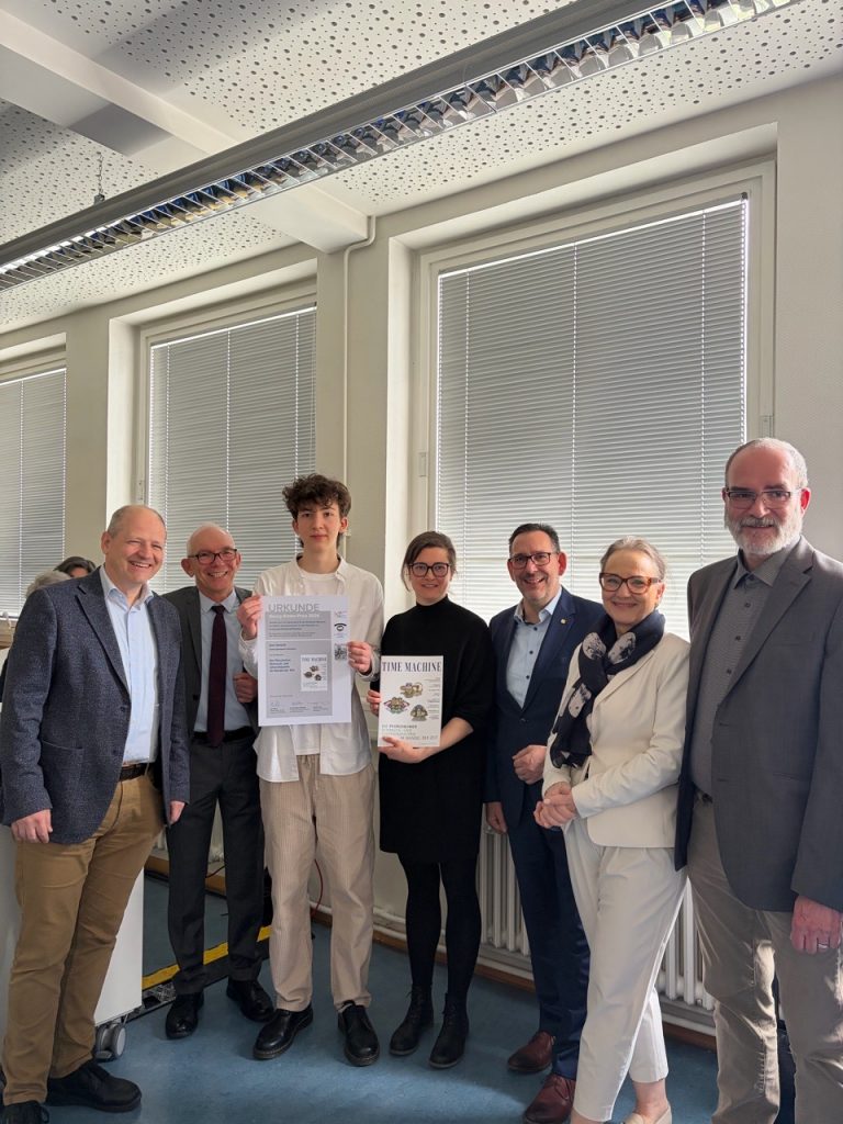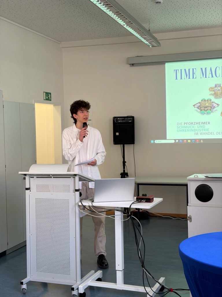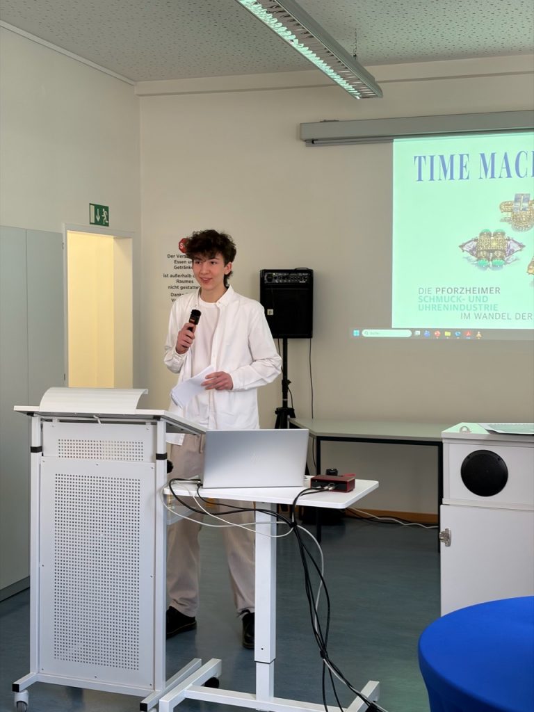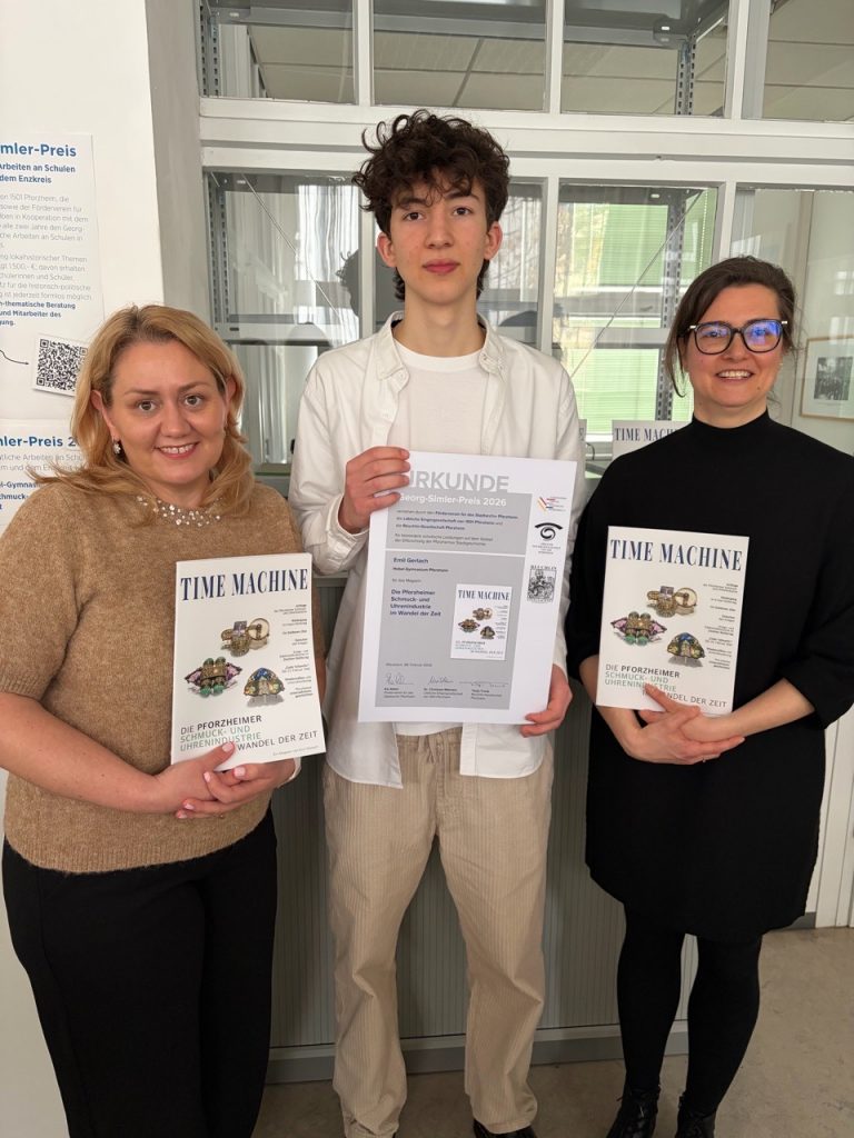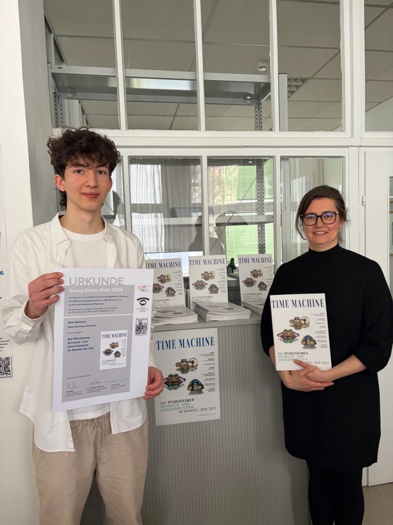Emil Gerlach aus der Klasse 10a/m des Hebel-Gymnasiums hat den diesjährigen Georg-Simler-Preis für seine herausragende Leistung auf dem Gebiet der stadthistorischen Arbeit erhalten. Dieser wird vom Förderverein für das Stadtarchiv Pforzheim, der Löblichen Singergesellschaft von 1501 und der Reuchlin-Gesellschaft Pforzheim verliehen und ist mit 1.500 € Preisgeld dotiert. Die drei Vereine möchten so junge Menschen motivieren, sich mit Aspekten der Geschichte unserer Stadt auseinanderzusetzen. Emil hat sich diesen Preis mit einer Überblicksarbeit über die „Pforzheimer Schmuck- und Uhrenindustrie im Wandel der Zeit“ verdient, die er als „Time Machine“ in Magazinform hat binden lassen. Der Druck des Heftes wurde vom BVSU (Bundesverband Schmuck und Uhren) finanziert und in einer Auflage von 1.500 Exemplaren gedruckt. Die Geschichtslehrerin Regina Senn-Killinger begleitete Emils Arbeit im Rahmen der Geschichte-AG am Hebel-Gymnasium für diesen Wettbewerb als Tutorin und unterstützte ihn bei den umfangreichen Archivrecherchen. Vor allem sie und der Preisträger, aber auch die ganze Schulgemeinschaft des Hebel-Gymnasiums sind stolz und freuen sich über diese hervorragende Leistung!